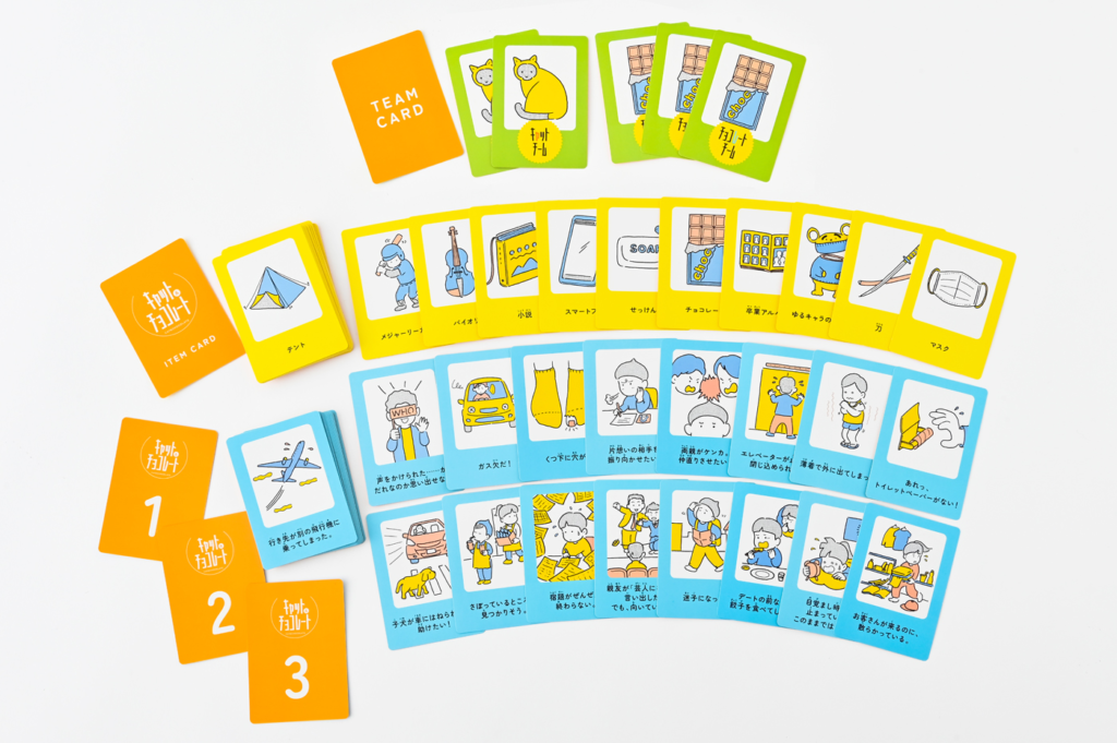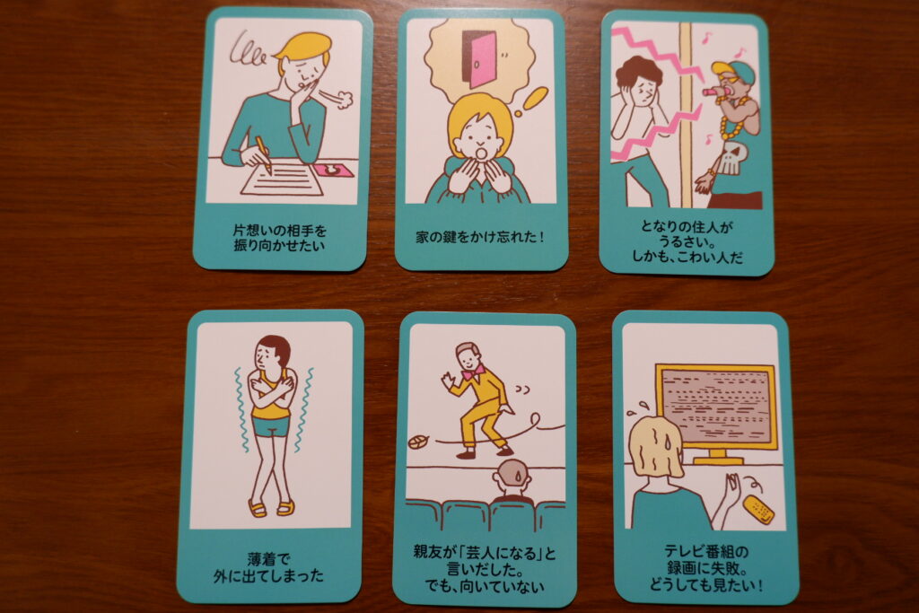 お題や使えるアイテムカードは、遊ぶシリーズによって異なります。上の写真は、日常編(初版版)のお題カードの一部です。アイテムをどう使うかだけでなく、「そもそもどう解決したらいいの?」と悩んでしまうようなお題もあって考えさせられます。