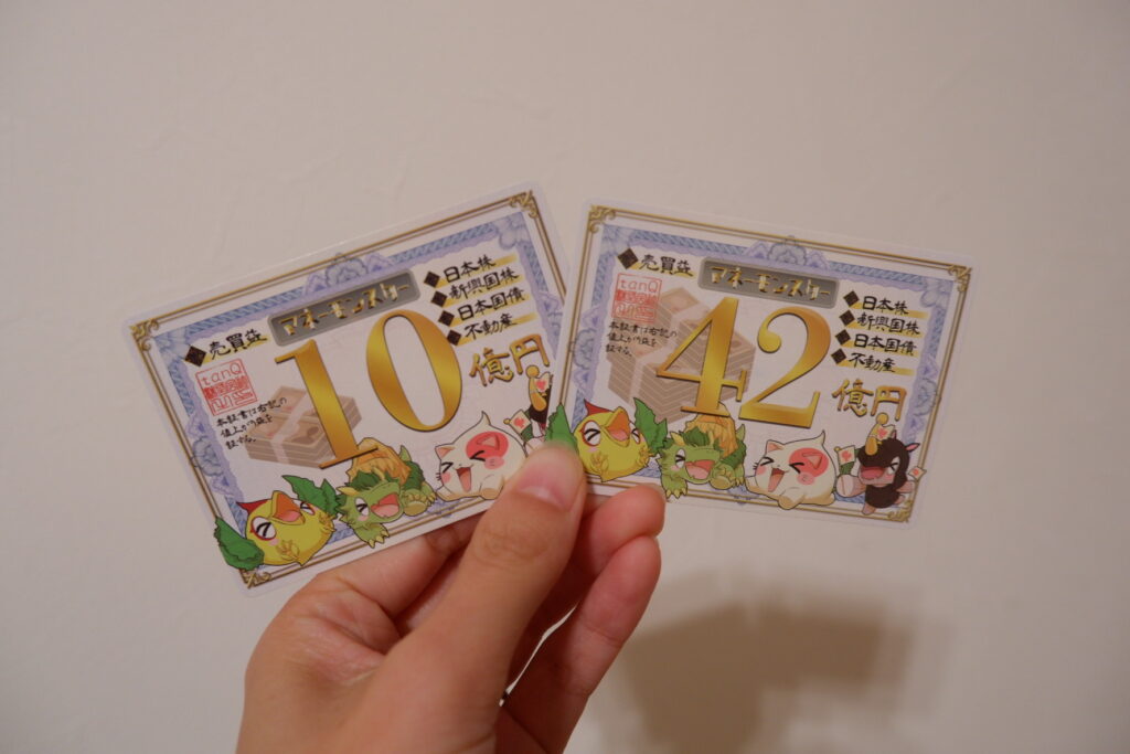 大人が2人で遊んだというのも原因のひとつだと思いますが、どうしても運ゲー要素が強くもったいないと感じました。どのターンでもプレイヤーが同じマネモン(投資方法)を選んでゴールもほぼ同時だったので、勝敗はキャピタルゲインカードの金額の多さだけで決まりました。