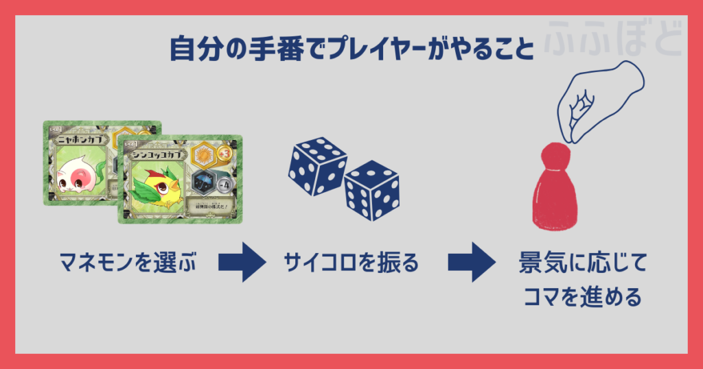 このように、ターン毎に景気が変動します。景気の変動に伴って、マネモンの動きも変化するので、ただのすごろくに比べてゲーム性が高いです。サイコロの出目によっては、「不景気だったからコクサイに替えたのに、好景気になっちゃった!」となんてことが起こっちゃうわけですね。
