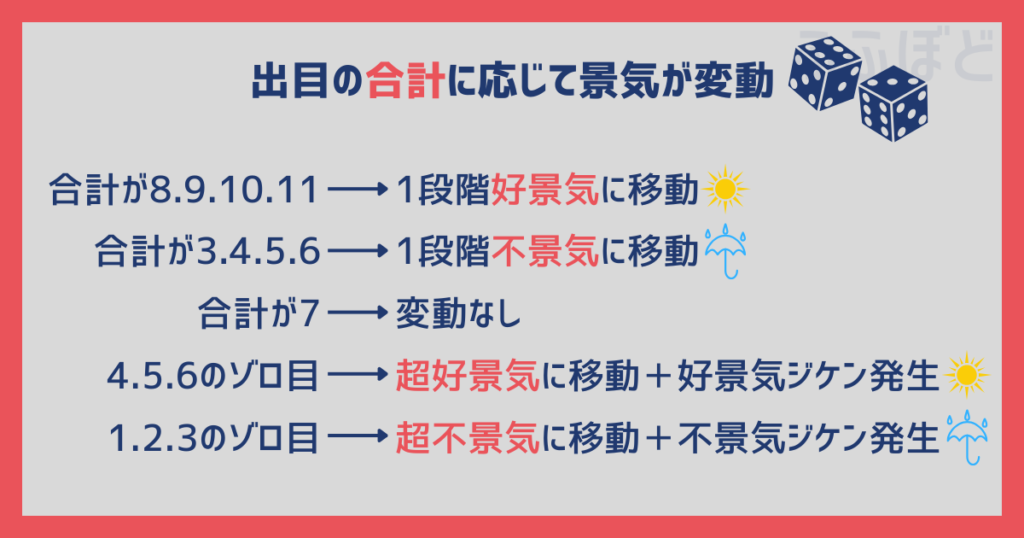 景気は、「超不景気」「不景気」「曇り」「好景気」「超好景気」の全5段階に分けられ、サイコロが振られるたびに次のように変動します。