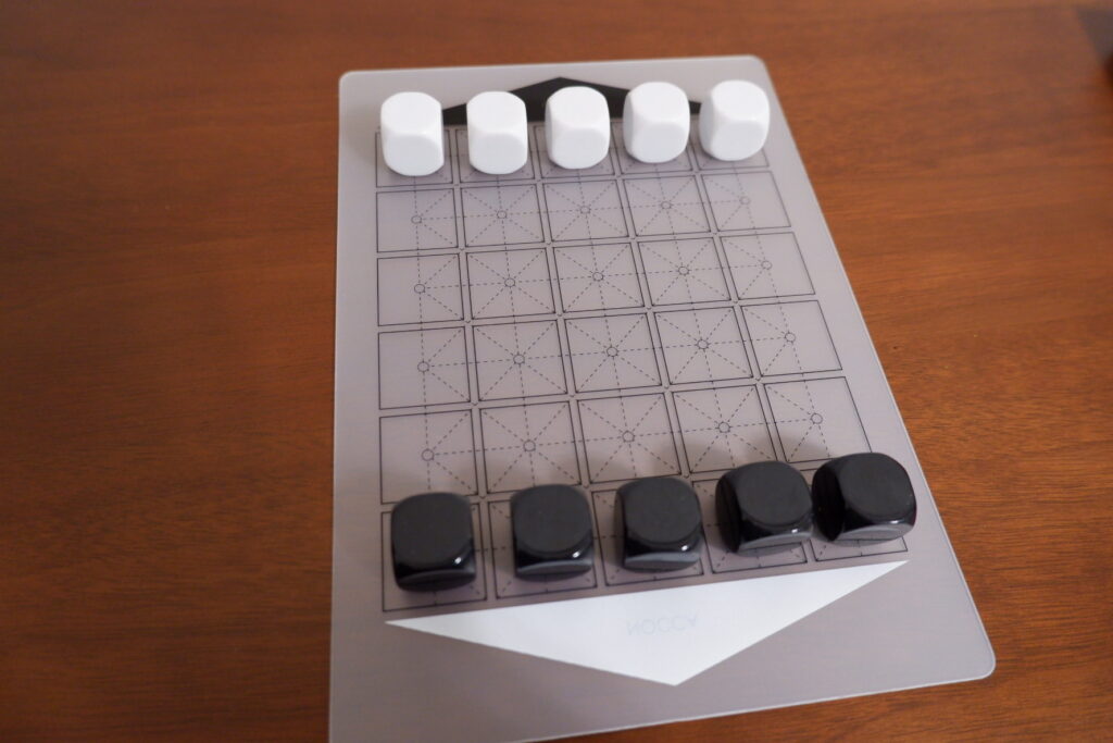 ノッカノッカは、プレイボードと白と黒のコマ各5個だけで遊べるシンプルなボードゲームです。