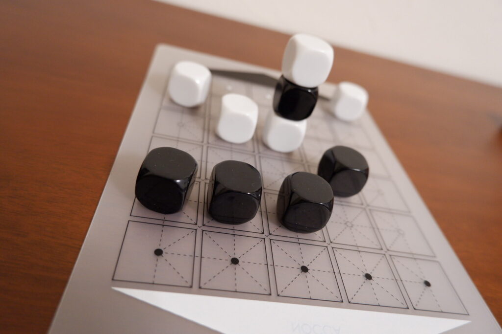 コロンとしたキューブ駒が可愛い。デザインに惹かれてルールのシンプルさを知り購入した口です。駒の納め方もオシャレ。難点を上げるなら、指が当たると1つの駒が水平に回り傾いてしまうので、綺麗に並べようと別の方向に思考が回ってしまうことですかね。