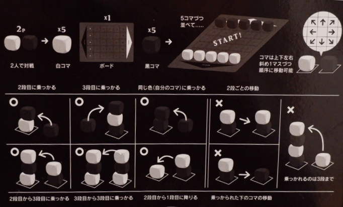 乗っかる・乗っかられるを繰り返して、1コマでも敵の陣地に入り込めたら勝利です。また、コマに乗っかられると動けなくなるので、すべてのコマが動けなくなったらその時点で敗北します。