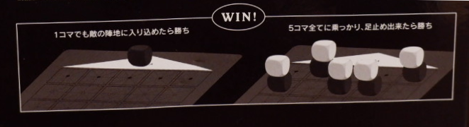 プレイヤーは、自分のコマを相手の陣地にゴールする、または、相手のすべてのコマに自分のコマを乗っけることで勝利します。